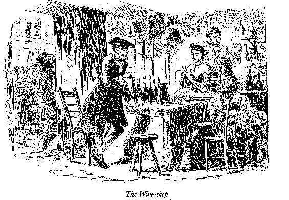 the moss and leaves, like the more fortunate hares who could find a living there. Château and hut, stone face and dangling figure, the red stain on the stone floor, and the pure water in the village well--thousands of acres of land--a whole province of France--all France itself--lay under the night sky, concentrated into a faint hairbreadth line. So does a whole world, with all its greatnesses and littlenesses, lie in a twinkling star. And as mere human knowledge can split a ray of light and analyse the manner of its composition, so, sublimer intelligences may read in the feeble shining of this earth of ours, every thought and act, every vice and virtue, of every responsible creature on it. The Defarges, husband and wife, came lumbering under the starlight, in their public vehicle, to that gate of Paris whereunto their journey naturally tended. There was the usual stoppage at the barrier guardhouse, and the usual lanterns came glancing forth for the usual examination and inquiry. Monsieur Defarge alighted; knowing one or two of the soldiery there, and one of the police. The latter he was intimate with, and affectionately embraced. When Saint Antoine had again enfolded the Defarges in his dusky wings, and they, having finally alighted near the Saint's boundaries, were picking their way on foot through the black mud and offal of his streets, Madame Defarge spoke to her husband: `Say then, my friend; what did Jacques of the police tell thee?' `Very little tonight, but all he knows. There is another spy commissioned for our quarter. There may be many more, for all that he can say, but he knows of one.' `Eh well!' said Madame Defarge, raising her eyebrows with a cool business air. `It is necessary to register him. How do they call that man?' `He is English.' `So much the better. His name?' `Barsad,' said Defarge, making it French by pronunciation. But, he had been so careful to get it accurately, that he then spelt it with perfect correctness. `Barsad,,' repeated madame. `Good. Christian name?' `John.' `John Barsad,' repeated madame, after murmuring it once to herself. `Good. His appearance; is it known?' |