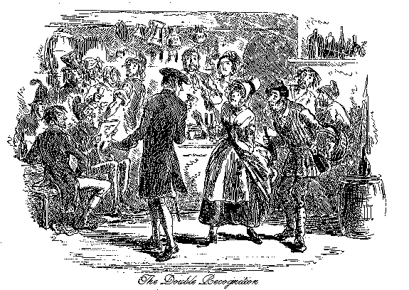 beard had never grown, for the National Razor shaved him close. Having purchased a few small articles of grocery, and a measure of oil for the lamp, Miss Pross bethought herself of the wine they wanted. After peeping into several wine-shops, she stopped at the sign of The Good Republican Brutus of Antiquity, not far from the National Palace, once (and twice) the Tuileries, where the aspect of things rather took her fancy. It had a quieter look than any other place of the same description they had passed, and, though red with patriotic caps, was not so red as the rest. Sounding Mr. Cruncher, and finding him of her opinion, Miss Pross resorted to The Good Republican Brutus of Antiquity, attended by her cavalier. Slightly observant of the smoky lights; of the people, pipe in mouth, playing with limp cards and yellow dominoes; of the one bare-breasted, bare-armed, soot-begrimed workman reading a journal aloud, and of the others listening to him; of the weapons worn, or laid aside to be resumed; of the two or three customers fallen forward asleep, who in the popular high- shouldered shaggy black spencer looked, in that attitude, like slumbering bears or dogs; the two outlandish customers approached the counter, and showed what they wanted. As their wine was measuring out, a man parted from another man in a comer, and rose to depart. In going, he had to face Miss Pross. No sooner did he face her, than Miss Pross uttered a scream, and clapped her hands. In a moment, the whole company were on their feet. That somebody was assassinated by somebody vindicating a difference of opinion was the likeliest occurrence. Everybody looked to see somebody fall, but only saw a man and a woman standing staring at each other; the man with all the outward aspect of a Frenchman and a thorough Republicans the woman, evidently English. What was said in this disappointing anti-climax, by the disciples of the Good Republican Brutus of Antiquity, except that it was something very voluble and loud, would have been as so much Hebrew or Chaldean to Miss Pross and her protector, though they had been all ears. But, they had no ears for anything in their surprise. For, it must be recorded, that not only was Miss Pross lost in amazement and agitation, but, Mr. Cruncher--though it seemed on his own separate and individual account--was in a state of the greatest wonder. `What is the matter?' said the man who had caused Miss Pross to scream; speaking in a vexed, abrupt voice (though in a low tone), and in English. `Oh, Solomon, dear Solomon!' cried Miss Pross, clapping her hands again. `Alter not setting eyes upon you or hearing of you for so long a time, do I find you here!' Don't call me Solomon. Do you want to be the death of me?' asked the man, in a furtive, frightened way. `Brother, brother!' cried Miss Pross, bursting into tears. `Have I ever been so hard with you that you ask me such a cruel question?' Then hold your meddlesome tongue,' said Solomon, `and come out, if you want to speak to me. Pay for your wine, and come out. Who's this man?' |