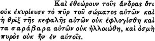 A.D. (?). [Greek Text] Kai eqewroun touV andraV oti ouk ekurieuse to pur tou swmatoV autwn kai