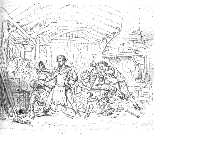 OUR history begins before we are born. We represent the hereditary influences of our race, and our ancestors virtually live in us. The sentiment of ancestry seems to be inherent in human nature, especially in the more civilised races. At all events, we cannot help having a due regard for the history of our forefathers. Our curiosity is stimulated by their immediate or indirect influence upon ourselves. It may be a generous enthusiasm, or, as some might say, a harmless vanity, to take pride in the honour of their name. The gifts of nature, however, are more valuable than those of fortune; and no line of ancestry, however honourable, can absolve us from the duty of diligent application and perseverance, or from the practice of the virtues of self-control and self-help. Sir Bernard Burke, in his Peerage and Baronetage Ed 1879 Pp 885-6, gives a faithful account of the ancestors from whom I am lineally descended. "The family of Naesymth, he says, "is one of remote antiquity in Tweeddale, and has possessed lands there since the 13th century." They fought in the wars of Bruce and Baliol, which ended in the independence of Scotland. The following is the family legend of the origin of the name of Naesymth:-- In the troublous times which prevailed in Scotland before the union of the Crowns, the feuds between the King and the Barons were almost constant. In the reign of James III. the House of Douglas was the most prominent and ambitious. The Earl not only resisted his liege lord, but entered into a combination with the King of England, from whom he received a pension . He was declared a rebel, and his estates were confiscated. He determined to resist the royal power, and crossed the Border with his followers. He was met by the Earl of Angus, the Maxwells, the Johnstons, and the Scotts. In one of the engagements which ensued the Douglases appeared to have gained the day, when an ancestor of the Naesmyths, who fought under the royal standard, took refuge in the smithy of a neighbouring village. The smith offered him protection, disguised him as a hammerman, with a leather apron in front, and asked him to lend a hand at his work. While thus engaged a party of the Douglas partisans entered the smithy. They looked with suspicion on the disguised hammerman, who, in his agitation, struck a false blow with the sledge hammer, which broke the shaft in two. Upon this, one of the pursuers rushed at him, calling out, "Ye're nae smyth!" The stalwart hammerman turned upon his assailant, and, wrenching a dagger from him, speedily overpowered him. The smith himself, armed with a big hammer, effectually aided in overpowering and driving out the Douglas men. A party of the royal forces made their appearance, when Naesmyth rallied them, led them against the rebels, and converted what had been a temporary defeat into a victory. A grant of lands was bestowed upon him for his service. His armorial bearings consisted of a hand dexter with a dagger, between two broken hammer-shafts, and there they remain to this day. The motto was, Non arte sect marte,"Not by art but by war?' In my time I have reversed the motto (Non marte sed arte); and instead of the broken hammer-shafts, I have adopted, not as my "arms" but as a device, the most potent form of mechanical art -- the Steam Hammer.