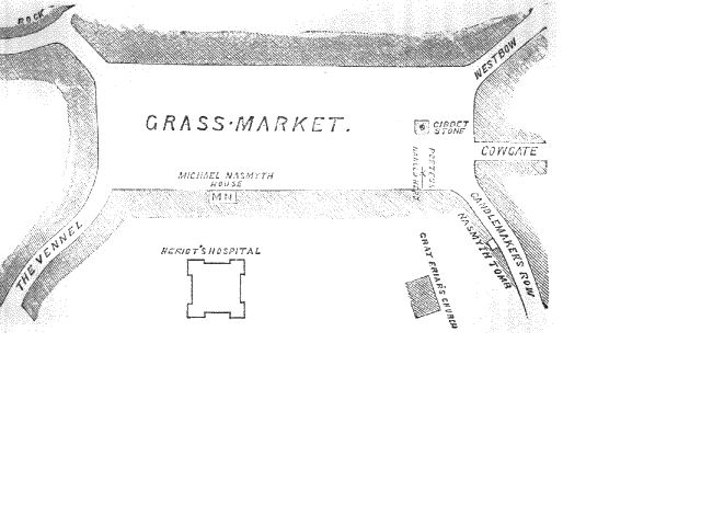 Alexander Nasmyth ContentsBorn 1758 - Grassmarket , My father, Alexander Nasmyth, was the second son of Michael Nasmyth. He was born in his father's house in the Grassmarket on the 9th of September 1758. The Grassmarket was then a lively place. On certain days of the week it was busy with sheep and cattle fairs. It was the centre of Edinburgh traffic. Most of the inns were situated there, or in the street leading up to the Greyfriars Church gate. The view from my grandfather's house was very grand. Standing up, right opposite, was the steep Castle rock, with its crown buildings and circular battery towering high overhead. They seemed almost to hang over the verge of the rock. The houses on the opposite side of the Grassmarket were crowded under the esplanade of the Castle Hill. There was an inn opposite the house where my father was born, from which the first coach started from Edinburgh to Newcastle. The public notice stated that "The Coach would set out from the Grass Market ilka Tuesday at Twa o'clock in the day, GOD WULLIN', but whether or no on Wednesday." The "whether or no was meant, I presume, as a precaution to passengers, in case all the places on the coach might be taken, or not, on Wednesday, The Grassmarket was also the place for public executions. The gibbet stone was at the east end of the Market. It consisted of a mass of solid sandstone, with a quadrangular hole in the middle, which served as a socket for the gallows. Most of the Covenanters who were executed for conscience' sake in the reigns of Charles II. and James II. breathed their last at this spot. The Porteous mob, in 1736, had its culmination here. When Captain Porteous was dragged out of the Tolbooth in the High Street and hurried down the West Bow, the gallows was not in its place; but the leaders of the mob hanged him from a dyer's pole, nearly opposite the gallows stone, on the south side of the street, not far from my grandfather's door See Heart of Midlothian I have not much to say about my father's education. For the most part, he was his own schoolmaster. I have heard him say that his mother taught him his A B C; and that he afterwards learned to read at Mammy Smith's. This old lady kept a school for boys and girls at the top of a house in the Grassmarket. There my father was taught to rear his Bible, and to repeat his Carritch# As it was only the bigger boys who could read the Bible, the strongest of them consummated the feat by climbing up the Castle rock, and reaching what they called "The Bibler's Seat." It must have been a break-neck adventure to get up to the place. The seat was almost immediately under the window of the room in which James VI was born. My father often pointed it out to me as one of the most dangerous bits of climbing in which he had been engaged in his younger years. The annexed illustration is from his own slight sepia drawing; the Bibler's Seat is marked + Not so daring, but much more mischievous, was a trick which he played with some of his companions on the tops of the houses on the north side of the Grassmarket. The boys took a barrel to the Castlehill, filled it with small stones, and then shot it down towards the roofs of the houses in the Grassmarket. The barrel leapt from rock to rock, burst, and scattered a shower of stones far and wide. The fun was to see the |