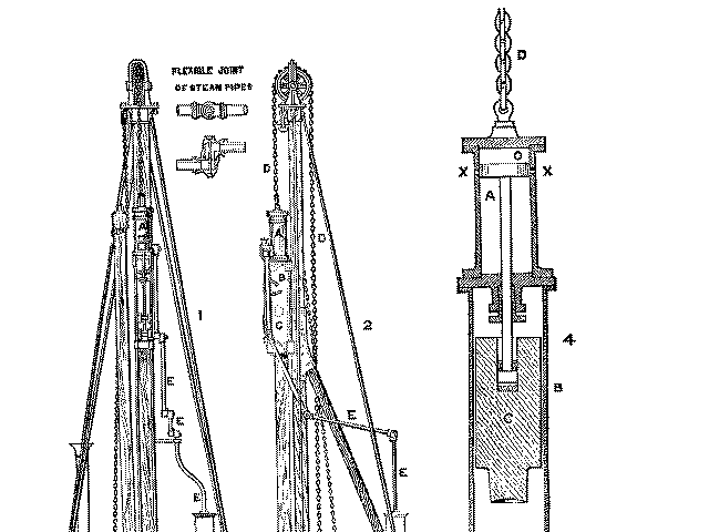 I have said that the steam pile-driver was in my mind's eye long before I saw it in action. It is one of the most delightful results of the possession of the constructive faculty, that one can build up in the mind mechanical structures and set them to work in imagination, and observe beforehand the various details performing their respective functions, as if they were in absolute material form and action. Unless this happy faculty exists ab initio in the brain of the mechanical engineer, he will have a hard and disappointing life before him. It is the early cultivation of the imagination which gives the right flexibility to the thinking faculties. Thus business, commerce, and mechanics are all the better for a little healthy imagination. So soon as I had returned home, I set to work and prepared the working drawings of the steam pile- drivers. They were soon completed, conveyed to Devonport, and erected on the spot where they were to be used. They were ready on the 3d of July 1845. Some preliminary pile-driving had been done in the usual way, in order to make a stage or elevated way for my pile-driver to travel along the space where the permanent piles were to be driven. I arranged my machines so that they might travel by their own locomotive powers along the whole length of the coffer dam, and also that they should hoist up the great logs of Baltic timber which formed the Piles into their proper places before being driven. The entire apparatus of the machine was erected on a strong timber platform, and was placed on wheels, so that it might move along the rails laid down upon the timber way. The same boiler that supplied the steam hammer part of the apparatus served to work the small steam-engine fixed to the platform for its locomotion, and also to perform the duty of rearing the next pile which had to be driven. The steam was conveyed to the hammer cylinder by the jointed pipe seen in the annexed engraving. The pipe accommodated itself to any elevation or descent of the hammer. The whole weight of the cylinder, hammer-block, and guide box, supported by the shoulders of the pile, amounting to seven tons in all, rested upon the shoulders of the pile as a "persuader;" and the eighty blows per minute of the four-ton hammer came down with tremendous energy upon the top of the pile head. No soil, that piles could penetrate, could resist such effective agencies.