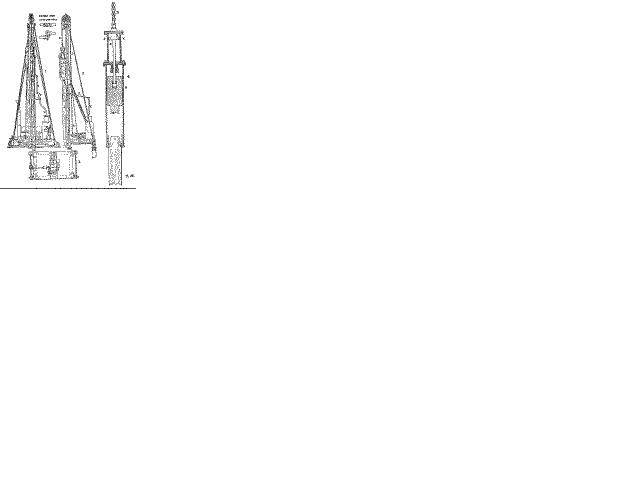 Explanation of the Diagram of the Steam Pile-Driver. -- The chief feature of novelty of this pile-driving machine consists in the employment of the direct action of the Steam Hammer as the blow giving agent, and also in the manner in which the dead weight of the entire apparatus, consisting of the hammer-block C, the steam cylinder A, and its guide-case B, is employed to importantly aid the effect of the rapid and energetic blows of the steam hammer. These ponderous parts rest on the shoulders of the pile H all the while it is being driven, the pile in this respect being the only support of the apparatus A B C. So that, besides the eighty blows per minute that the four-ton steam hammer energetically deals out to the head of the pile from a four foot fall the dead weight of the apparatus constantly acts as a most effective "predisposer" to the sinking of the pile into the ground; the hoisting chain D being let slack the while, so as to allow A. B C to "follow down" the pile H, while the eighty blows per minute are incessantly showered on its head. The upward stroke of the piston, with its attached hammer-block C, is arrested at the proper height not only by allowing the steam that raised it to escape, but as soon as the piston passes the escape holes X X, the confined air above the piston at O rebounds, and so aids most effectively in increasing the energy of the fall of the hammer-block C on the pile head. There was a great deal of curiosity in the dockyard as to the action of the new machine. The pile-driving machine-men gave me a good-natured challenge to vie with them in driving down a pile. They adopted the old method, while I adopted the new one. The resident managers sought out two great pile logs of equal size and length -- 70 feet long and 18 inches square. At a given signal we started together. I let in the steam, and the hammer at once began to work. The four-ton block showered down blows at the rate of eighty a minute; and in the course of four and a half minutes my pile was driven down to the required depth. The men working at the ordinary machine had only begun to drive. It took them upwards of twelve hours to complete the driving of their pile! |