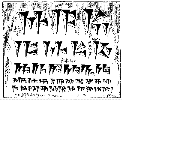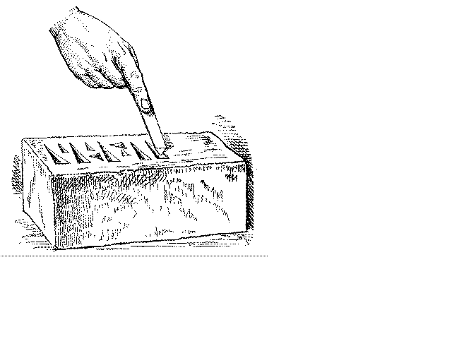 I was so fortunate as to have my conjectures confirmed with respect to the exact form of the instrument by which these remarkable characters are produced, observing, in what appeared to be a hastily-formed inscription on the edge of a large brick, that the inscriber had apparently used rather more pressure on his stylus than was requisite. In consequence of which, the end of it had been so deeply depressed into the soft clay as to leave an exact counterpart of its size and form. I secured a cast of this over-deep impression of the stylus, from which Fig. 3 is taken, after a photograph. In order further to illustrate the simple mode of producing inscriptions on tablets of clay, I give in Fig. 4 a tablet inscription produced by means of the stylus which is seen laid over the tablet. The next illustration(Fig.5) is intended to convey an idea of the manner in which the stylus was held and applied to the surface of the clay when a cuneiform inscription was being produced. The upper, flat, or third side of the stylus enabled the inscriber to keep it in correct relative position in respect to the tablet, yielding at the same time a convenient flat surface upon which to rest the end of his finger when indenting the angular end into the clay. |