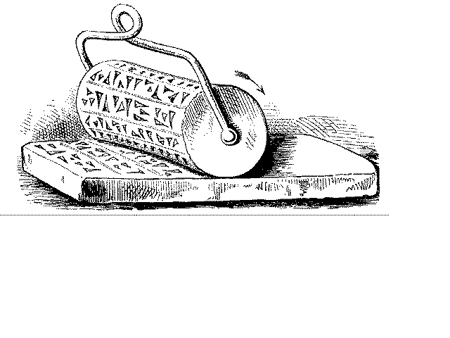 the subject by actual casts from the inscriptions themselves. At Cheltenham the question gave rise to a most animated and interesting discussion, in which Dr. Whewell and Sir Thomas Phillips (the great antiquarian) took a prominent part. I understood that Sir Thomas Phillips assigned that the intermixture of cuneiform with the Greek alphabet proceeded from the Samaritans, who were originally an Assyrian colony. I find that many Greek inscriptions exhibit the cuneiform element in nearly all the letters composing them. This is a subject well worthy of the attention of our antiquarian Greek scholars, as pointing to an intimate intercourse with the Assyrians at some remote age. The distinctive character of the cuneiform in the Greek inscriptional letters could not have arisen from chance. Some intercommunication with the Assyrians must have taken place. This subject is all the more interesting, as the cuneiform element appears to have passed from the Greek inscriptional letters into those of the Romans, and from thence into our own capital letters. This affords a very remarkable instance of the "survival" of a form, which, however naturally due to the plastic material in connection with which it originated, nevertheless led to its use for ages after the circumstances which led to its adoption had passed away. This tendency in mankind to cling to shapes and forms through mere traditional influences is widely observable, especially in connection with architectural forms, arrangements, and decorative details. It offers a subject of great interest to those who have a natural aptitude to investigate what I may term the etymology of form, a subject of the most attractive nature, especially to those who enjoy thinking and reflecting upon what they have specially observed. Before concluding this subject I may mention that the Assyrians employed a cylindrical roller-seal in order to produce impressions in a wholesale way. This is exemplified in the above engraving. The mechanical principles inherent in this beautifully simple form of roller-seal, indicate a high order of ingenuity, well worthy of the originators of the arrow-headed character. In fact it is the prototype not only of the modern system of calico-printing but of the Waiter Printing Press, by which the Times and many other newspapers are now printed -- a remarkable instance of the survival or restoration of a very old method of impression. |